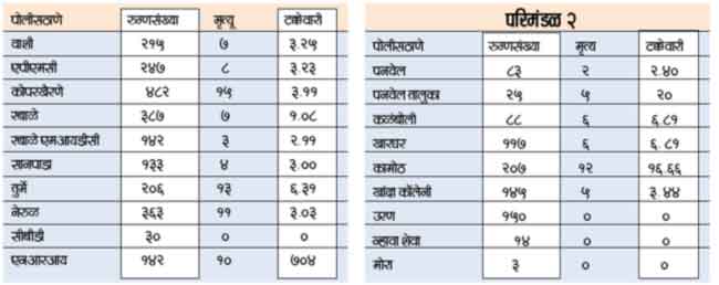 नवी मुंबई महापालिका क्षेत्रात सर्वात कमी रुग्णसंख्या ही सीबीडी पोलीस ठाणे अंतर्गत असून ३० करोना रुग्ण सापडले आहेत. सुदैवाने अद्याप एकही मृत्यू झाला नाही तसेच परिमंडळ दोनमध्ये सर्वाधिक रुग्ण कामोठे येथे २०७ आहेत. तर सर्वात कमी तीन रुग्ण मोरा पोलीस ठाणे अंतर्गत आहेत.