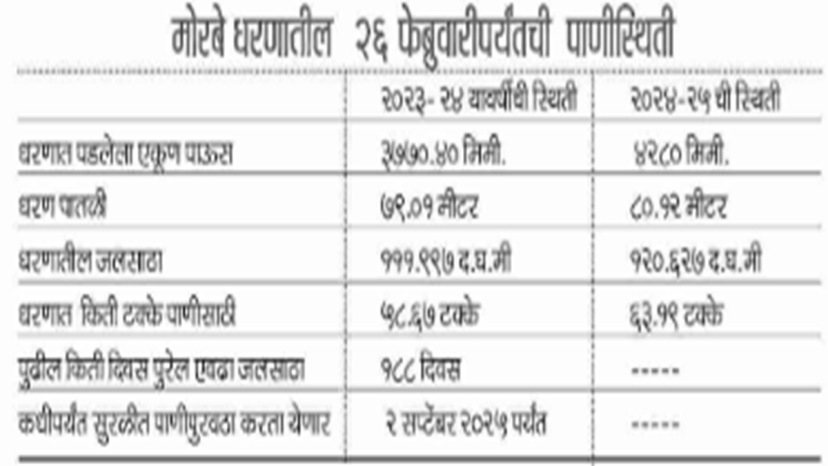 यंदा मोरबे धरणक्षेत्रात चांगला पाऊस झाल्याने धरण १०० टक्के भरले होते. पाणी उपशाबाबत योग्य काळजी घेण्यात येत असून उद्याने व इतर ठिकाणी जास्तीत जास्त प्रक्रियायुक्त पाण्याचा वापर करण्यावर भर दिला आहे. धरणात गेल्यावर्षीच्या तुलनेत अधिक पाणी असले तरी पाणीपुरवठ्याबाबत योग्य ती खबरदारी घेण्यात येत आहे. – अरविंद शिंदे, अतिरिक्त शहर अभियंता, नवी मुंबई महापालिका
