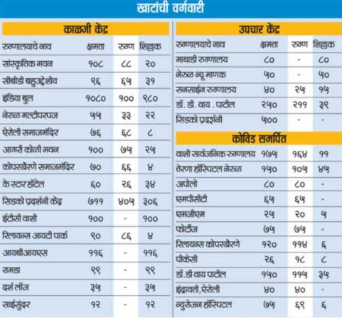 * नवी मुंबई पालिका क्षेत्रात करोना रुग्णांसाठी तीन प्रकारच्या व्यवस्था करण्यात आल्या आहेत. यात काळजी केंद्र, करोना उपचार केंद्र आणि समर्पित रुग्णालयाची उभारणी करण्यात आलीआहे. यात आवश्यकतेनुसार रुग्णालयात दाखल केले जाते. पालिका रुग्णालयांतील खाटांची संख्या कागदावर चांगली असते. परंतु, प्रत्यक्षात रुग्णांना दाखल करून घेतले जात नसल्याच्या अनेक तक्रारी समोर येत आहेत.