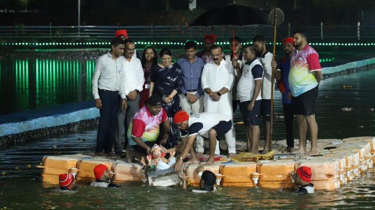 नवी मुंबई – नवी मुंबई शहरात गौरीच्या आगमनानंतर वेगळ्याच उत्साहात साजऱ्या होणाऱ्या गणेशोत्सवाचा गौरी गणपती विसर्जन सोहळा अतिशय भक्तीपूर्ण वातावरणात निर्विघ्नपणे पार पडला. नवी मुंबई महानगरपालिकेने सर्व विसर्जन स्थळांवर केलेल्या सुनियोजित व्यवस्थेमध्ये २२ नैसर्गिक आणि १४१ कृत्रिम विसर्जन स्थळांवर एकूण १९,०८४ श्रीगणेशमूर्तींचे व २२३८ गौरींचे विसर्जन संपन्न झाले. पालिका आयुक्तांनी विविध विसर्जन स्थळांना भेटी दिल्या. विशेष म्हणजे वाशी सेक्टर ६ येथील मध्यवर्ती विसर्जन तलावाच्या ठिकाणी आयुक्त राजेश नार्वेकर स्वयंसेवकांसह तराफ्यावरून श्री गणेश मूर्तीच्या विसर्जनासाठी जलाशयात गेले आयुक्त स्वतः गणेश मूर्ती विसर्जनासाठी तलावात आल्यामुळे स्वयंसेवकांमध्ये उत्साह होता.