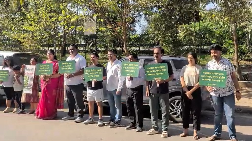 नवी मुंबई महापालिका प्रशासनाच्या विरुद्ध निषेध नोंदवण्यासाठी पाम बीच ग्रीन्स फोरमच्या वतीने आयोजित करण्यात आला होता.