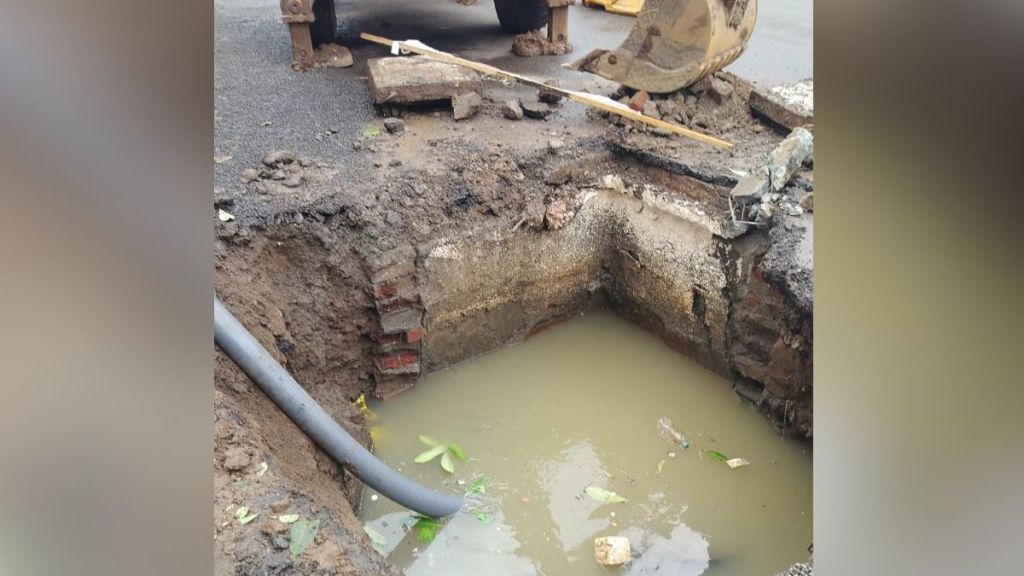 पनवेल: कामोठे वसाहतीमध्ये मागील दोन दिवसांपासून डांबरी रस्त्याला तीन वेगवेगळ्या ठिकाणी मोठे भगदाड पडले आहे. अचानक रस्ता खचला या भीतीने रहिवाशांमध्ये भिती निर्माण झाली. या सर्व परिस्थिती त्या भगदाडांमध्ये पावसाचे पाणी साचल्यावर इतर रस्ता खचू नये म्हणून पनवेल महापालिका हे साचलेले पाणी मोटारपंपाच्या साह्याने उपसत आहेत. रहिवाशी जेथे भगदाड पडले तेथे महानगर गॅस वाहिनीचे काम झाले होते, त्यामुळे या कंपनीविरोधात रहिवाशी संताप व्यक्त करत आहेत.