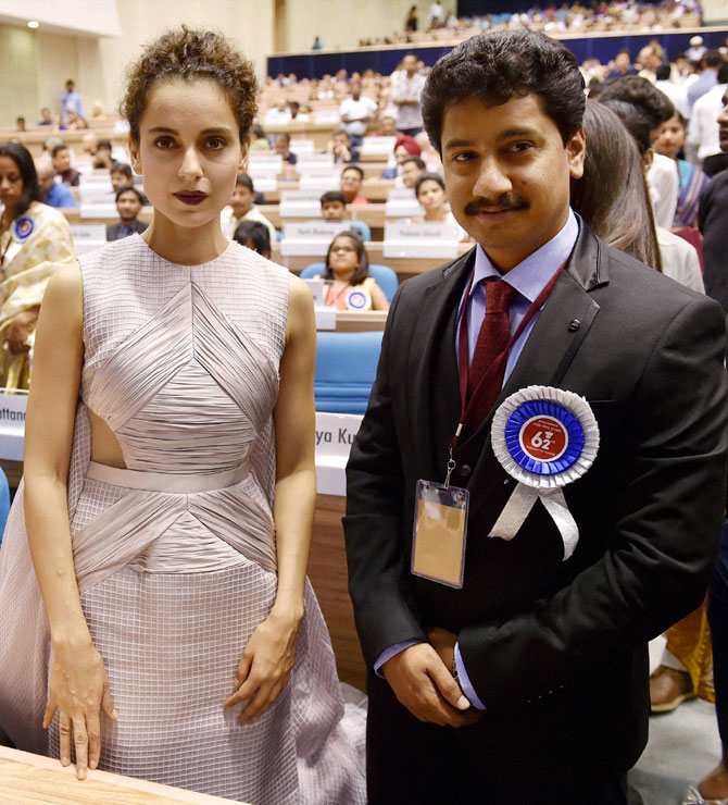 सर्वोत्कृष्ट अभिनेता पुरस्कार पटकाविणारा विजय कुमार याच्यासह पोज देताना कंगना राणावत. (छायाः पीटीआय)