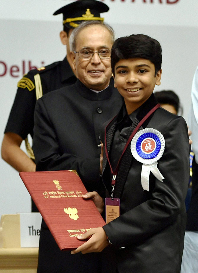 प्रादेशिक भाषांतील सर्वोत्कृष्ट ठरलेल्या किल्ला चित्रपटातील बालकलाकार पार्थ भालेराव याचाही यावेळी सन्मान करण्यात आला. (छायाः पीटीआय)