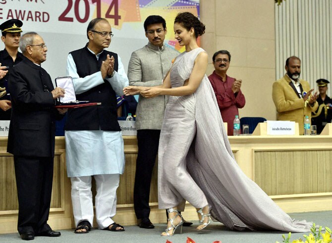 ‘क्वीन’ चित्रपटातील भूमिकेसाठी कंगना राणावत हिला सर्वोत्कृष्ट अभिनेत्री पुरस्काराने सन्मानित करण्यात आले. (छायाः पीटीआय)