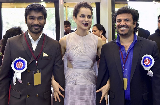 ६२व्या राष्ट्रीय पुरस्कारावर नाव कोरणारे मानकरी- कंगना राणावत, निर्माता विकास बहल आणि अभिनेता धनुष. (छायाः पीटीआय)