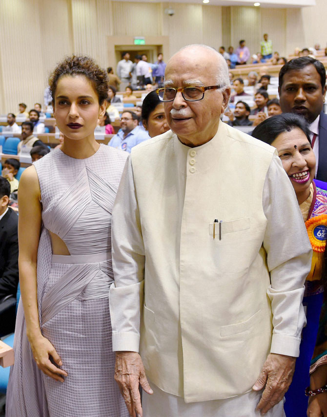 भाजप नेता लाल कृष्ण अडवाणी यांच्यासह कॅमे-यास पोज देताना कंगना. (छायाः पीटीआय)