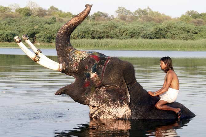 उन्हापासून थोडा वेळ थंडावा मिळावा म्हणून गजराजांना साबरमती नदीमध्ये आंघोळ घालताना माहूत. (छायाः पीटीआय)