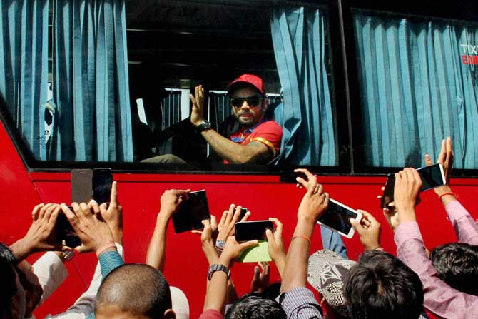 राचीच्या बिरसा मुंडा आंतरराष्ट्रीय विमानतळावर दाखल झालेल्या रॉयल चॅलेंजर बंगळूरुचा कर्णधार विराट कोहलीचा फोटो काढण्यास लोकांची झुंबड उडाली होती. (छायाः पीटीआय)