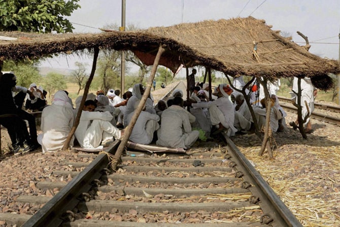 सरकारी नोकऱ्या आणि शैक्षणिक संस्थांमध्ये आरक्षण मिळावे या मागणीसाठी आंदोलन करणाऱ्या गुज्जर समाजातर्फे शुक्रवारी राजस्थानमधील भरतपूर जिल्ह्य़ातील बयाना खेडय़ाजवळील दिल्ली-मुंबई रेल्वेमार्गावर धरणे आंदोलन केले. (छायाः पीटीआय) -