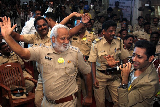 ‘तंबाखूमुक्त पोलीस ठाणे’ या उपक्रमाची सुरुवात शुक्रवारी अभिनेत्री रविना टंडन आणि अभिनेता विवेक ओबेरॉय यांच्या हस्ते आझाद मैदान पोलीस ठाण्याच्या प्रेरणा सभागृहात झाली. हा कार्यक्रम सुरू होण्याआधी एका गाण्यादरम्यान गायकाने पोलिसांना आवाहन करताच त्यांनी पुढे येत गाण्यावर ठेका धरला (छाया – प्रशांत नाडकर) -