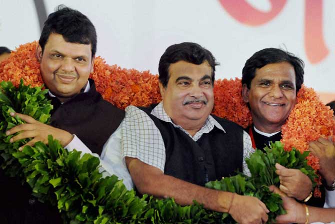 कोल्हापूर येथे भाजपच्या प्रदेश कार्यकारिणीच्या बैठकीत रविवारी केंद्रीय रस्ते वाहतूकमंत्री नितीन गडकरी, मुख्यमंत्री देवेंद्र फडणवीस व प्रदेशाध्यक्ष रावसाहेब दानवे यांचा सत्कार करण्यात आला. (छायाः पीटीआय)