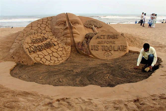 जागतिक तापमानवाढवर वाळूशिल्पकार सूदर्शन पटनायक यांनी साकारलेले वाळूशिल्प. (छायाः पीटीआय)