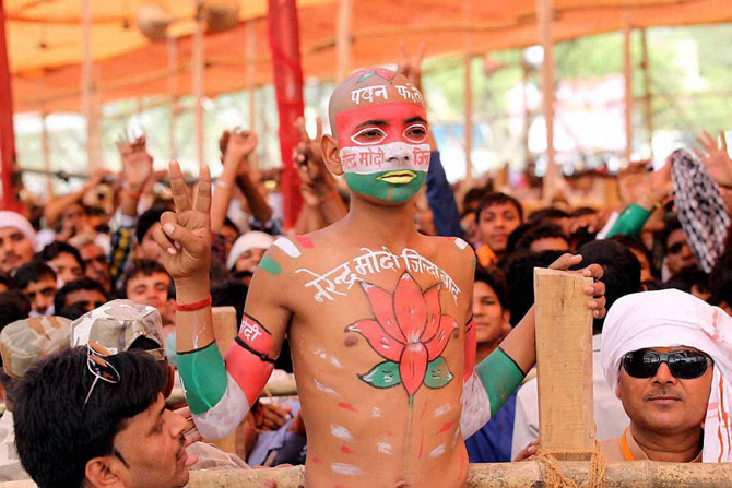 मथुरा येथील नरेंद्र मोदी यांच्या जन कल्याण रॅलीला सहभागी झालेला एक समर्थक. (छायाः पीटीआय)