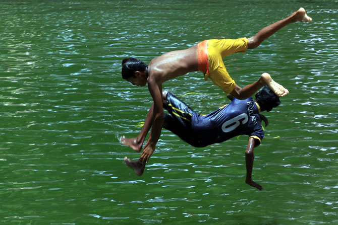 उन्हाचा पारा दिवसेंदिवस चढतच जात असल्याचे सध्या चित्र आहे. या उन्हावर मात करण्यासाठी आणि पोहण्याचा स्वच्छंद आनंद घेण्यासाठी बाणगंगा नदीत उडी मारताना तरुण. (छायाः गणेश शिर्सेकर) -