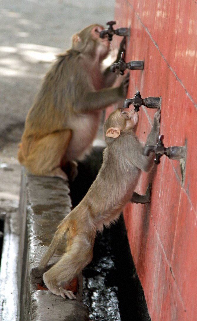 जागतिक तापमानात वाढ झाल्यामुळे उष्णतेची लाट आणखी तीव्र होत चालली आहे. मनुष्यांसह प्राण्यांनाही या झळांना सामोरे जावे लागत असल्याचे दिसते. जम्मूतही उन्हाचा कडाका वाढला असून नळातील पाणी पिताना ही माकडे. (छायाः पीटीआय)