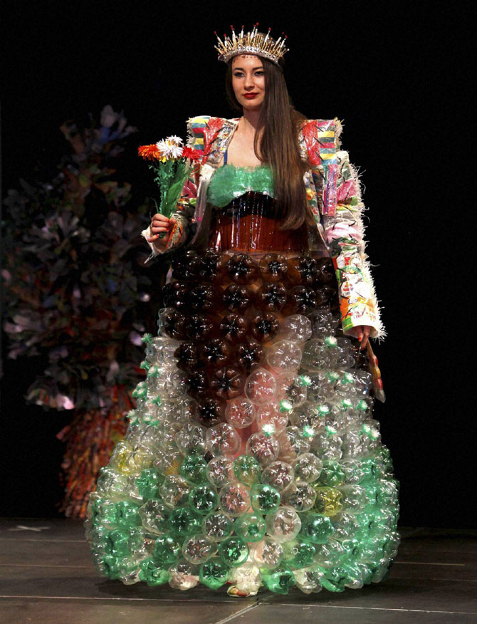 मॅसेडोनिया येथे गुरुवारी भरविण्यात आलेल्या ट्रॅश फॅशन शोमध्ये.मॉडेलने प्लास्टिकच्या बाटल्या आणि बॅगचा वापर करुन बनवण्यात आलेला पोशाख परिधान करुन रॅम्पवॉक केला. (छायाः पीटीआय)