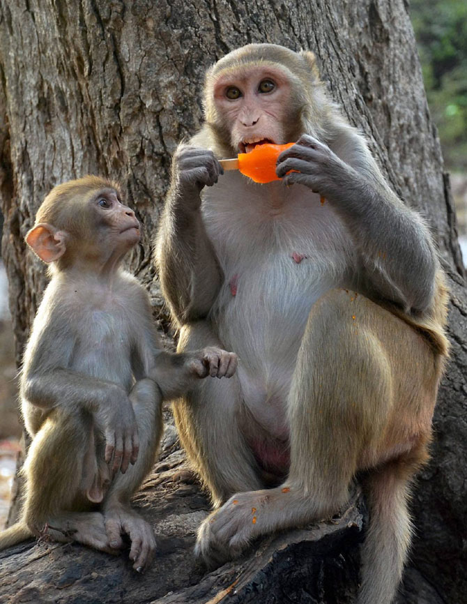 मिर्झापूर येथे उकाडा असह्य झालेल्या माकडाने आणि त्याच्या पिल्लाने आईस्क्रीमचा आनंद लुटला. (छायाः पीटीआय)