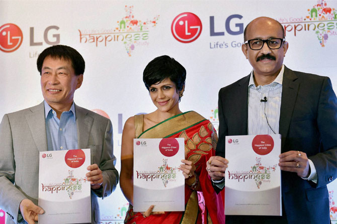 एलजी लाईफ गुड हॅपीनेस’ या अहवालाचे अभिनेत्री मंदिरा बेदीने गुरुवारी नवी दिल्लीमध्ये प्रकाशन केले. (छायाः पीटीआय) -
