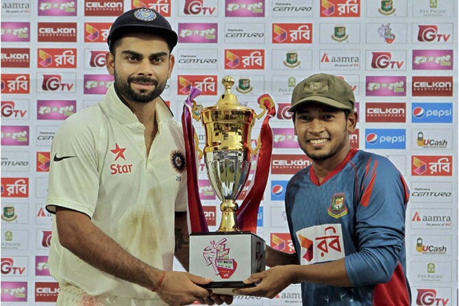 अश्विन ‘पंच’मीचा योग रविवारी खान साहेब उस्मान अली स्टेडियमवर होता. रविचंद्रन अश्विनने आपल्या लाजवाब फिरकीच्या बळावर बांगलादेशचा डाव गुंडाळला. परंतु पाचही दिवस पावसामुळे वारंवार धुमाकूळ घातलेल्या या एकमेव कसोटी सामन्यांत विजयाची आशा मात्र धरता आली नाही आणि अनिर्णीत निकालावर भारताला समाधान मानावे लागले. (छायाः पीटीआय)