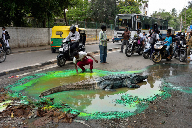 बंगळुरु येथील बादल नन्जुन्दास्वामी या कलाकाराने तात्पुरते एक छोटेसे तळे तयार केले असून त्यात कृत्रिम मगर सोडली आहे. बादलची कलाकृती रस्त्यावरून जाणा-या सर्व लोकांचे लक्ष केंद्रीत करतेयं. (छायाः पीटीआय)