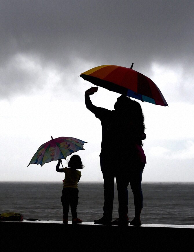 मान्सूनचा आनंद घेत सेल्फी टिपताना छोटे कुटुंब. (छायाः पीटीआय)
