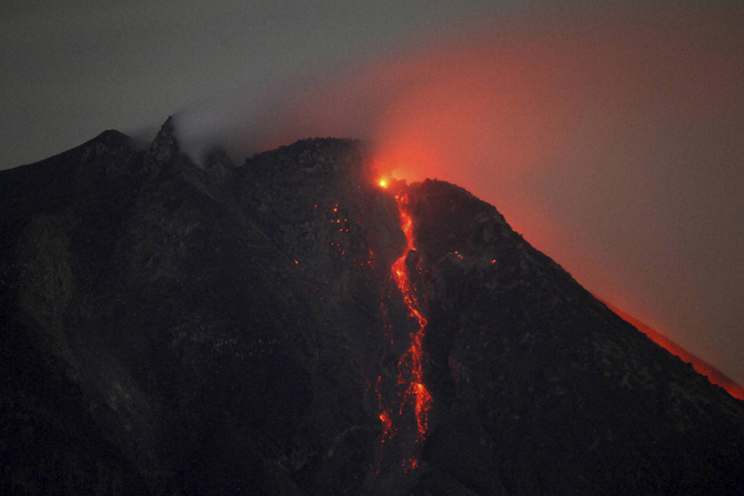 सिनबन्ग पर्वतातून गरम लावाचा प्रवाह होताना. (छायाः पीटीआय)