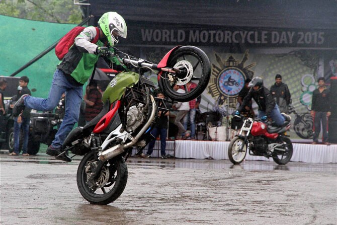 जागतिक मोटारसायकल दिनानिमित्त रविवारी ठाण्यात दुचाकीस्वारांनी थरारक प्रात्यक्षिके केली. (छायाः पीटीआय)
