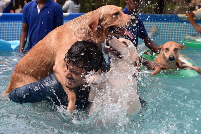 कुत्र्यांसाठी असलेल्या अॅक्वा जीममध्ये योगाचे धडे घेताना जीम ट्रेनरसह कुत्रा.(छायाः पीटीआय)