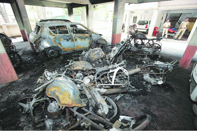 सिंहगड रस्त्यावरील सहा सोसायटय़ांच्या पार्किंगमध्ये लावलेली तब्बल ९० वाहने जाळून टाकण्याचा धक्कादायक प्रकार रविवारी पहाटे घडला. (छायाः लोकसत्ता)