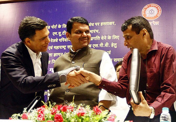 जयगड बंदर जोडण्यासाठी जेएसडब्ल्यू आणि कोकण रेल्वे महामंडळ यांच्यात रविवारी सामंजस्य करार करण्यात आला. या वेळी जेएसडब्ल्यू समूहाचे व्यवस्थापकीय संचालक सज्जन जिंदाल, मुख्यमंत्री देवेंद्र फडणवीस, व रेल्वेमंत्री सुरेश प्रभू उपस्थित होते. (छायाः गणेश शिर्सेकर)