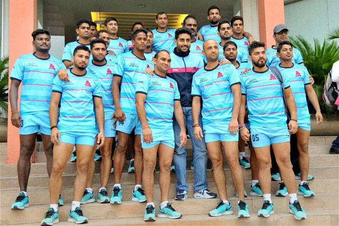 बॉलीवूड अभिनेता आणि जयपूर पिंक पॅन्थरचा मालक अभिषेक बच्चन आपल्या संघासह कॅमे-यास पोज देतान. (छायाः पीटीआय)
