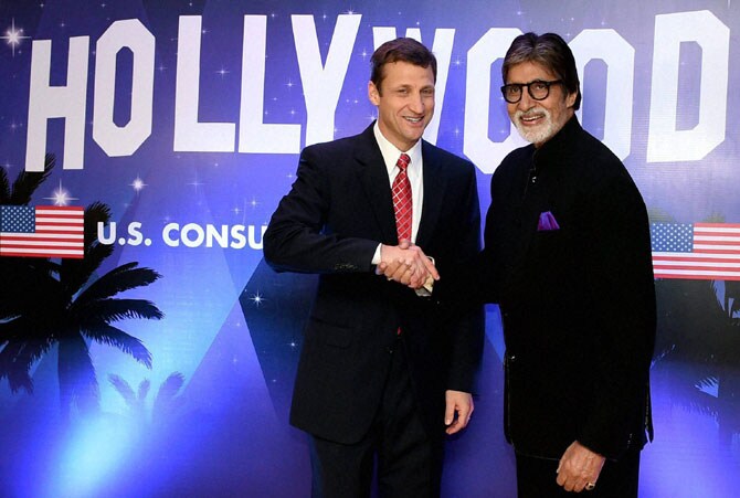 यूएस इंडिपेन्डन्सच्या २३९व्या वर्धापनदिनानिमित्त उपस्थित असलेल्या थॉमस वजदा यांची भेट घेताना अमिताभ बच्चन. (छायाः पीटीआय)