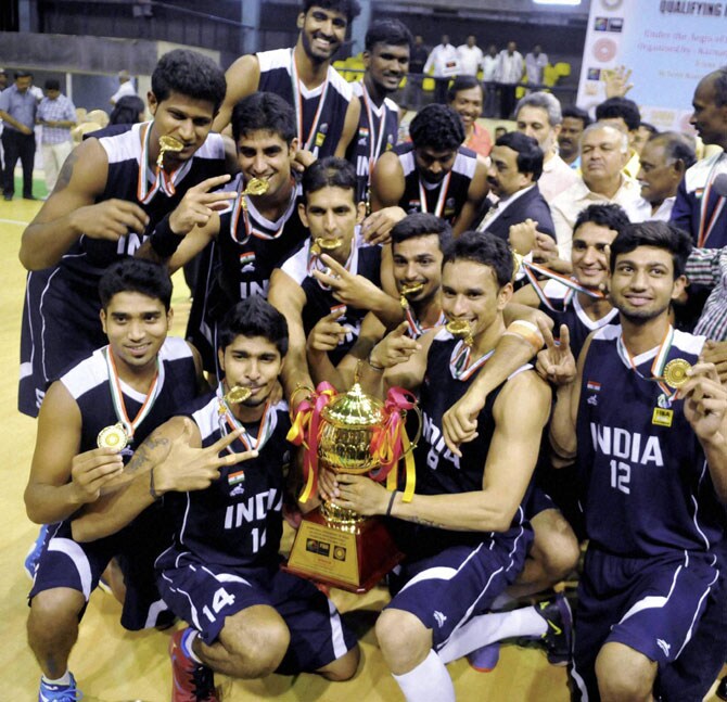 बंगळुरु येथे रविवारी झालेल्या चौथ्या साउथ एशियन बास्केटबॉल चॅम्पियनशीप स्पर्धेत श्रीलंकेच्या संघाचा पराभव केल्यानंतर आनंद साजरा करताना भारतीय बास्केटबॉल संघ. (छायाः पीटीआय)