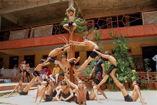 अहमदाबाद येथील शाळेत मल्लखांबाचा सराव करताना शाळकरी मुले. (छायाः पीटीआय)