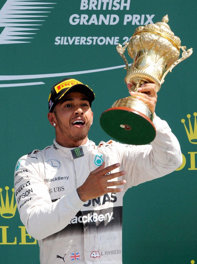 यंदाच्या हंगामातला जबरदस्त फॉर्म कायम राखत लुईस हॅमिल्टनने ब्रिटिश ग्रां. प्रि. शर्यतीत अव्वल स्थान पटकावले. या शर्यतीचे हॅमिल्टनचे हे सलग दुसरे जेतेपद आहे. (छायाः पीटीआय)