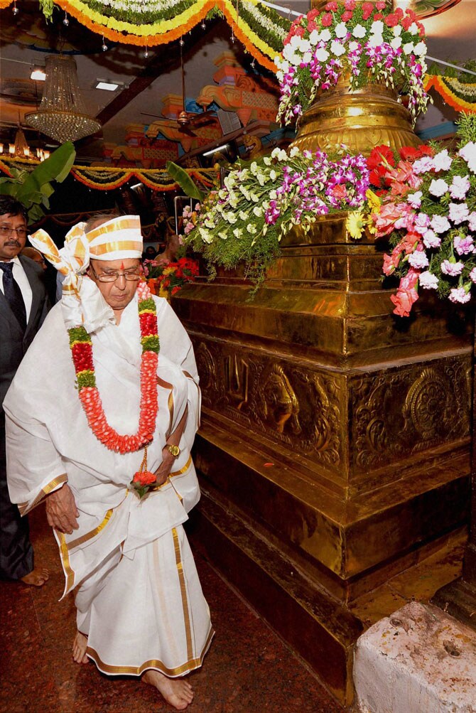 राष्ट्रपती प्रणव मुखर्जींनी रविवारी तेंलगणातील श्री लक्ष्मी नरसिंह स्वामी मंदिराला भेट दिली. (छायाः पीटीआय)