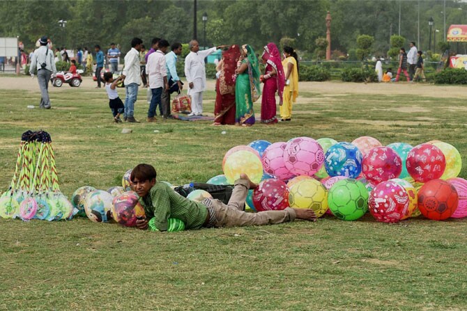 उन्हात रंगीबेरंगी फुगे विकून थकल्यानंतर दिल्लीतील एका बागेमध्ये विश्रांती घेताना फुगेवाला. (छायाः पीटीआय) -