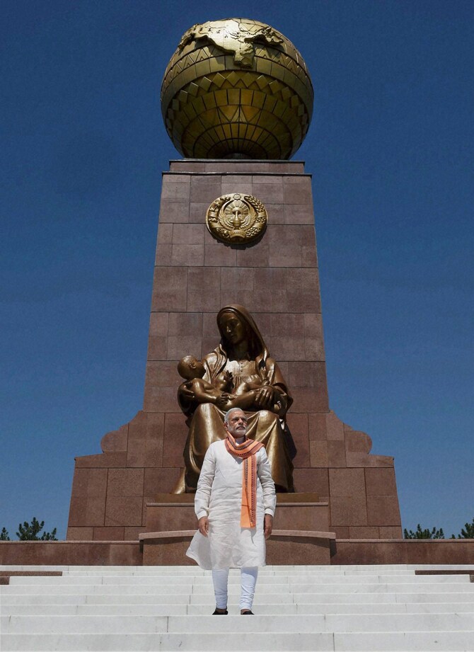 पंतप्रधान नरेंद्र मोदी यांनी उझबेकिस्तानमधील ताश्कंद येथे मंगळवारी स्वातंत्र्य आणि मानवतेच्या स्मारकावर आदरांजली वाहिली. (छाया- पीटीआय) -