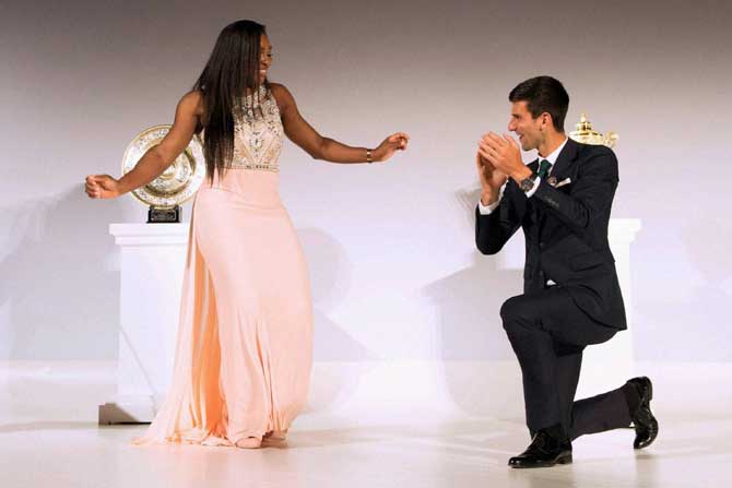 ऐतिहासिक वारसा लाभलेल्या विम्बल्डन टेनिस स्पर्धेच्या विजेत्यांसाठी खास मेजवानीचे आयोजन करण्यात येते. लंडनमधील गिल्डहॉल येथे आयोजित ‘विम्बल्डन चॅम्पियन डिनर’प्रसंगी विम्बल्डन एकेरीचे विजेते नोव्हाक जोकोव्हिच आणि सेरेना विल्यम्स यांनी आपल्या नृत्यनैपुण्याने उपस्थितांचे मने जिंकली. कोर्टवर अफलातून पदलालित्यासह जेतेपदावर नाव कोरणाऱ्या या विजेत्यांचे नृत्यकौशल्य त्यांच्या अष्टपैलू व्यक्तिमत्वाची प्रचीती देणारे होते. (छायाः पीटीआय)