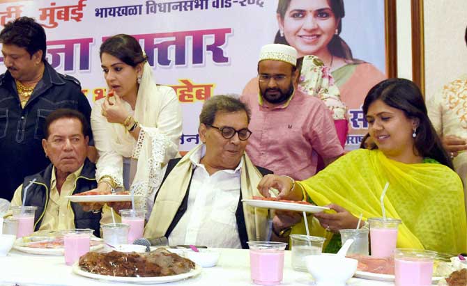 सलमानचे वडिल सलीम खान, भाजप नेत्या शायना एनसी, दिग्दर्शक सुभाष घई आणि पंकजा मुंडे मुंबईत झालेल्या इफ्तार पार्टीला उपस्थित होते. (छायाः पीटीआय)
