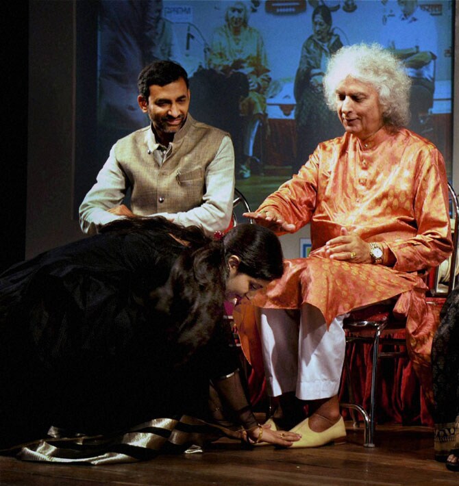 संतूर वादक पंडित शिवकुमार शर्मा यांचा आशीर्वाद घेताना गानसरस्वती किशोरी अमोणकर यांची नात तेजश्री अमोणकर. (छायाः पीटीआय)