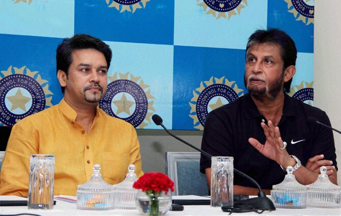 श्रीलंका दौ-यासाठी भारतीय संघाची निवड बैठक गुरुवारी पार पडली. त्यावळी बोलताना निवड समितीचे अध्यक्ष संदीप पाटील आणि बीसीसीआय सचिन अनुराग ठाकूर. (छायाः पीटीआय)