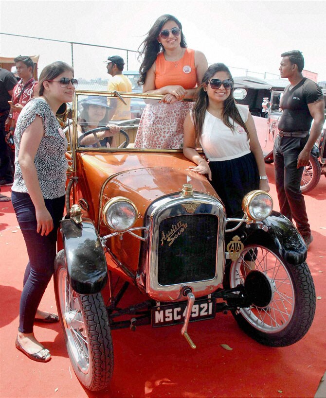 हैद्राबाद येथे झालेल्या ‘वूमन व्हिंटेज कार रॅली’ दरम्यान कारसोबत पोज देताना काही महिला. (छायाः पीटीआय)