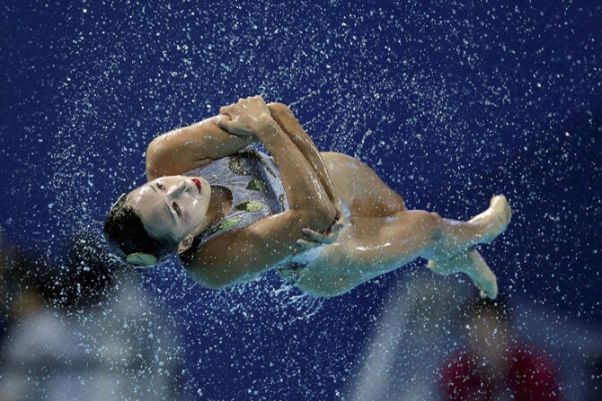 कझान येथे झालेल्या जागतिक तरणपटू स्पर्धेत पाण्यात कसरती करताना एक स्पर्धक. (छायाः पीटीआय)