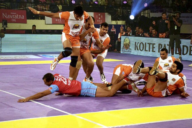 जयपूर पिंकपँथर्सच्या चढाईपटूची पकड करण्याचा पुणेरी पलटणचा फसलेला डाव. (छायाः पीटीआय) -