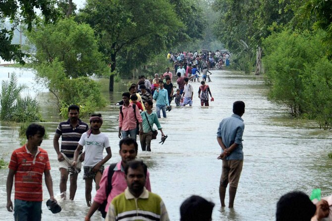 पश्चिम बंगालमध्ये पावसाने थैमान घातले असून, पुरग्रस्त जगतबल्लवपूर येथे रविवारी हावडा-आमता महामार्गावर साचलेल्या पाण्यातून मार्गक्रमण करताना गावकरी. (छायाः पीटीआय)
