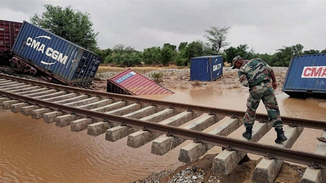 पुराच्या लोंढ्यामुळे राजस्थानमधील रेल्वे मार्ग वाहून गेला. यामुळे मालगाडी घसरली. (छायाः पीटीआय)