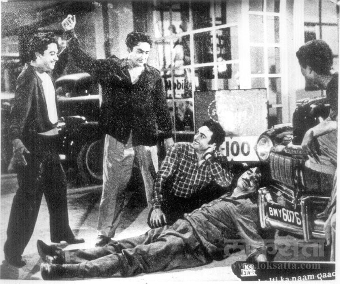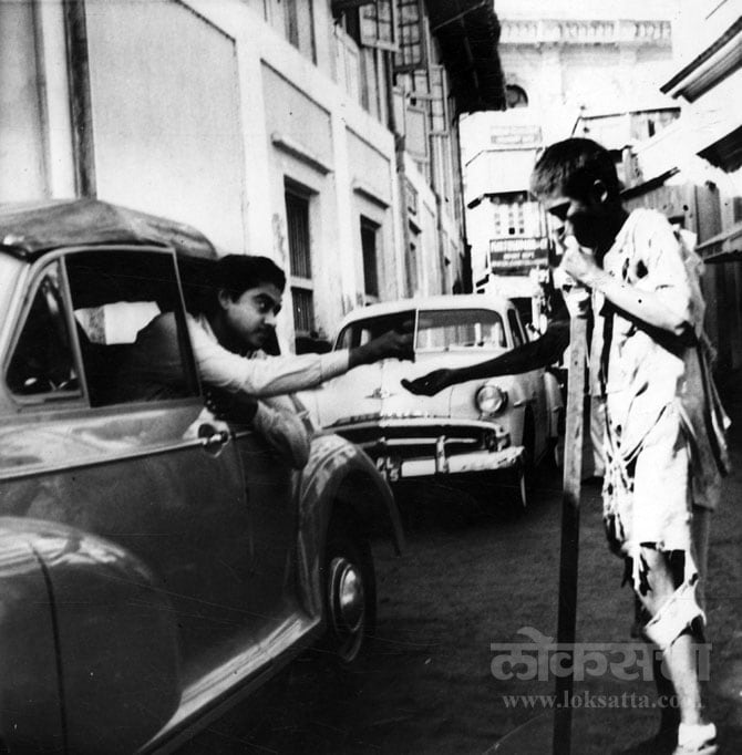 रस्त्यावरील एका गरिबास मदत करताना किशोर कुमार.