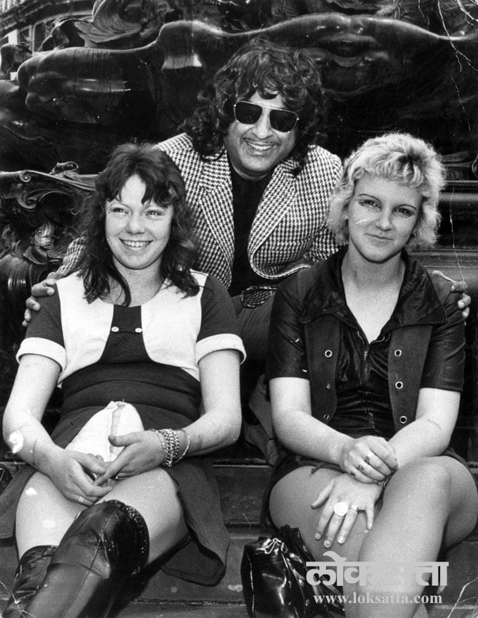 परदेशी तरुणींसह कॅमे-यास पोज देताना किशोर कुमार.